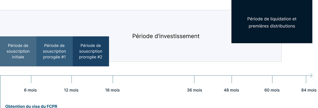Le FCPR a une durée de vie de 5 ans (prorogeable deux fois un an sur décision de la Société de Gestion pour assurer la liquidation des investissements, soit un total de 7 ans). Pendant la durée de vie du FCPR aucun rachat de parts n'est possible et les avoirs des Investisseurs sont bloqués, sauf cas de rachat exceptionnels prévus au règlement du FCPR.